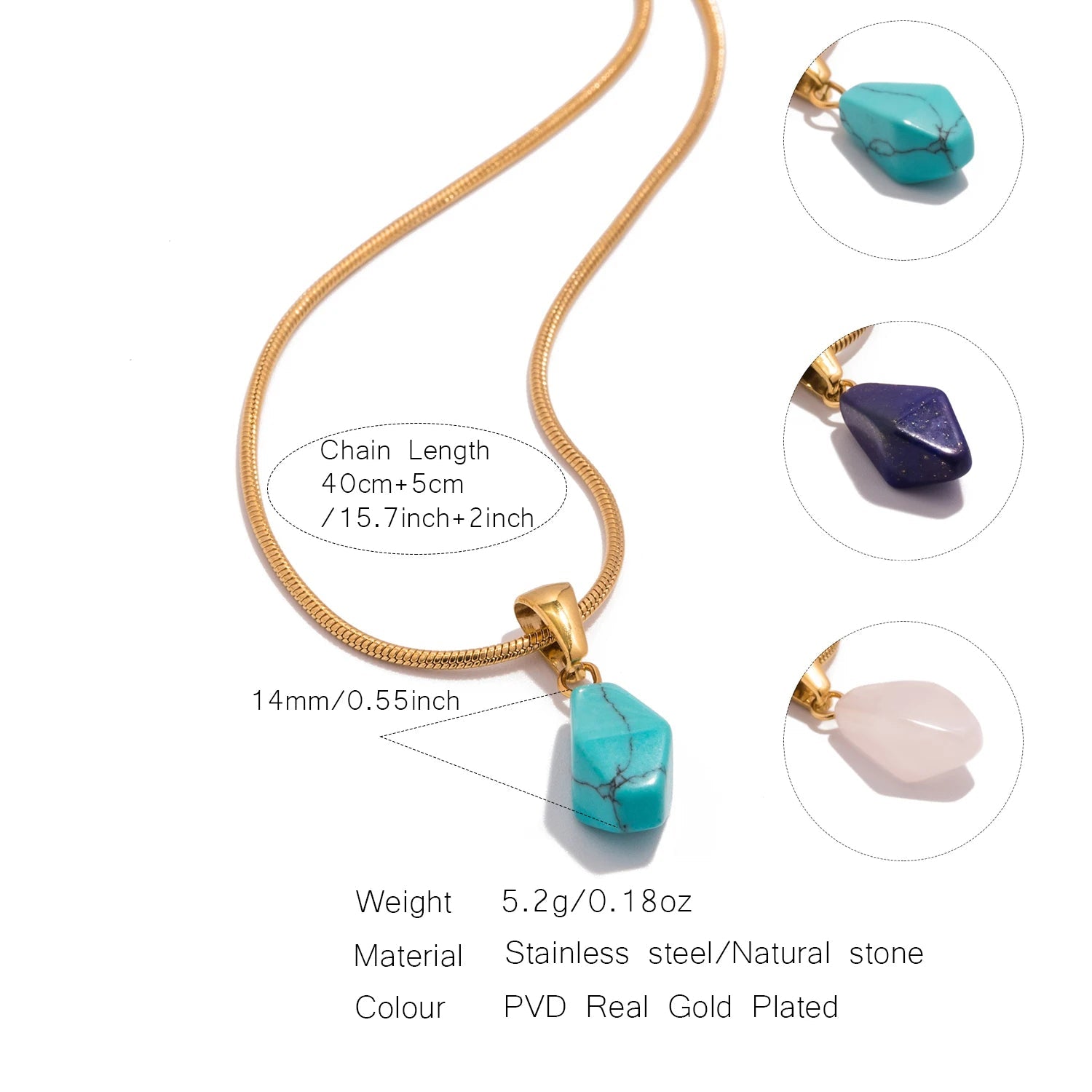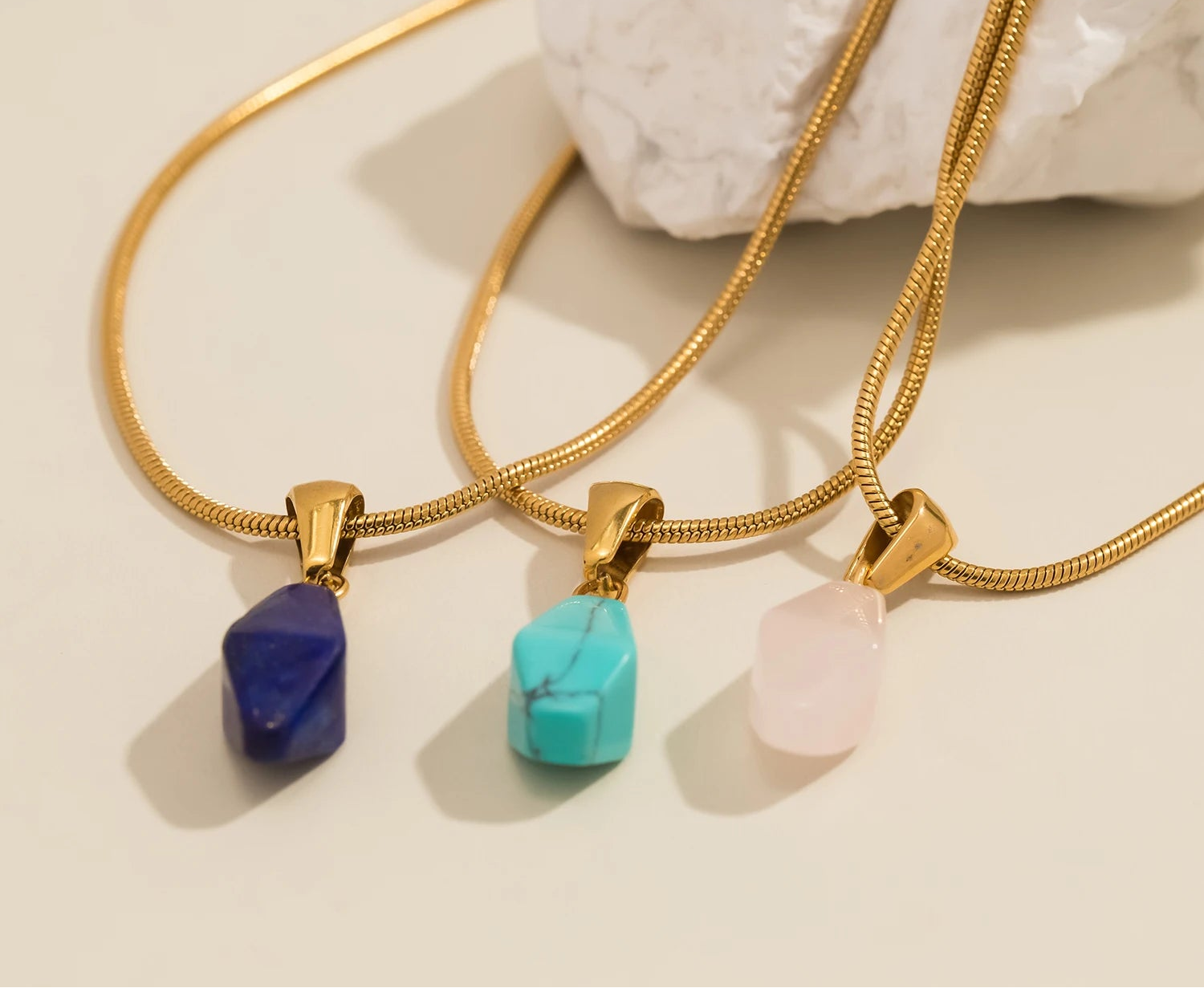 This minimalist pendant features a smooth, geometric natural stone suspended from a sleek stainless steel snake chain. Waterproof, hypoallergenic, and beautifully versatile, it’s designed to bring elegance and ease to your everyday rituals.